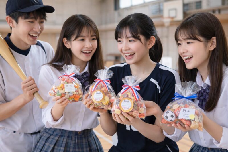 - 競技モチーフを混ぜる(ボール柄のチョコ、バット風のスティック菓子など)
