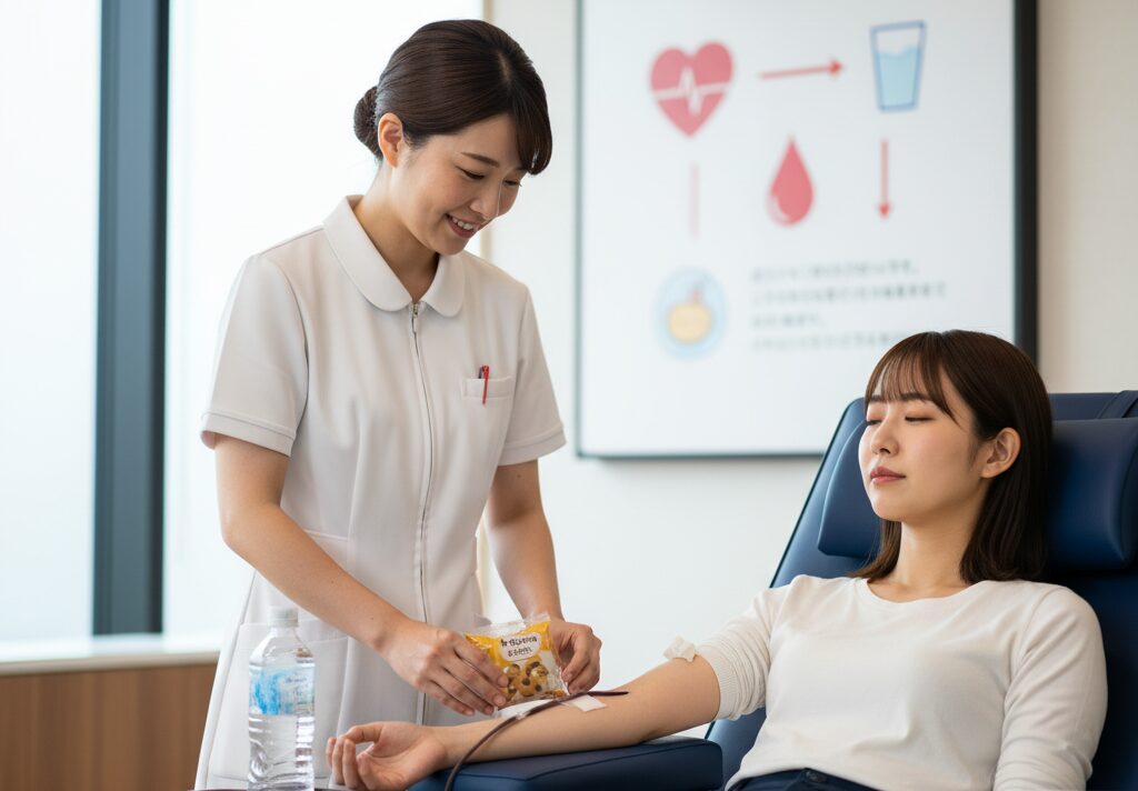 献血後にお菓子が提供されるのには、単なるサービス以上の、献血者の体調を気遣う医学的な理由がしっかりと存在します。献血によって体内の血液量が減少すると、身体は一時的に循環血液量が不足した状態になります。これにより、血圧が低下しやすくなるのです。